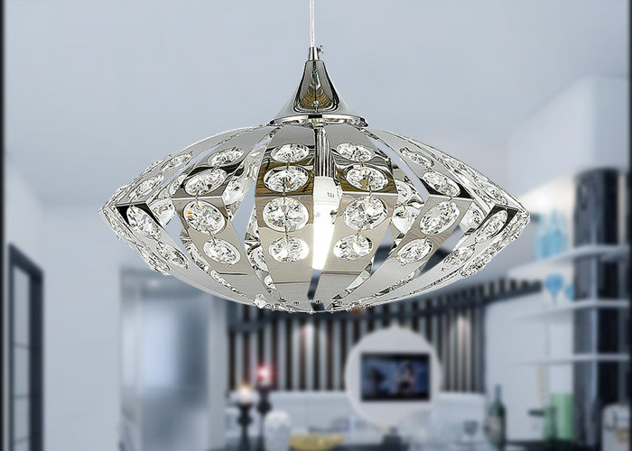 UFO Shape K9 Crystal Chandelier Pendant Light for Dining Room / Hotel Quick details: Material: Stainless steel and K9 crystal Size:Diameter: 45CM (from left to right, measure at farthest point), Height: 26CM (from top to bottom, excluding chain length), Adjustable chain length: 100CM, which can be adjusted any length that you need. Process way: Wire cut, polishing & electroplating Color of lamp body: Chrome + clear Attachment: Installation gloves, installation drawing manual