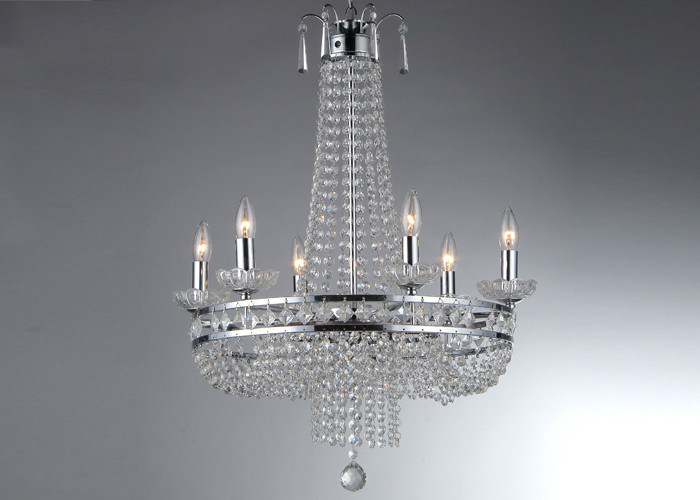 Chrome Modern Pendant 6 Crystal Candle Chandelier For Dining Rooms Dimensions: Product size: Φ500*H945 Specifications: 1. Cheap price and good quality 2. Popular new design 3. Short delievery time 4. OEM & ODM Applications: Housing Estates, hotels, bars, coffee shops, villas, dining rooms and conference rooms, show window,etc Our service: 1. Customer's Logo /Hangtag/Tape/Shipping mark :Acceptable 2. OEM&ODM:Acceptable 3. Changing on Color/Material/Instruction/Design