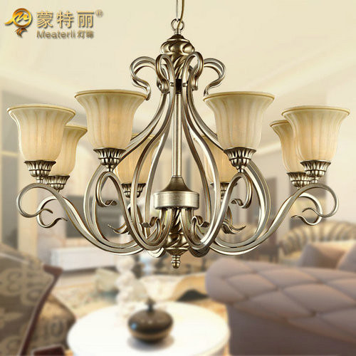 Modern Decorative Hanging Ceiling Lights / Glass Classic Chandelier CH005-8H Wrought Iron Pendant lamp, 8 heads Silver ground with gold painting for Dining-room lamp, Living room lamp, bedroom lamp & Corridor lamp. Description: Process way: Hot bending,soldering,japanning & baking Material: metal,fiber polymer Lamp shade Glass Size: Lamp diameter: 90CM,lamp height: 66CM, pendant chain length:28CM,(tolerance +/-2CM) Light source E27 incandescent/ energy saving/ LED blub(price